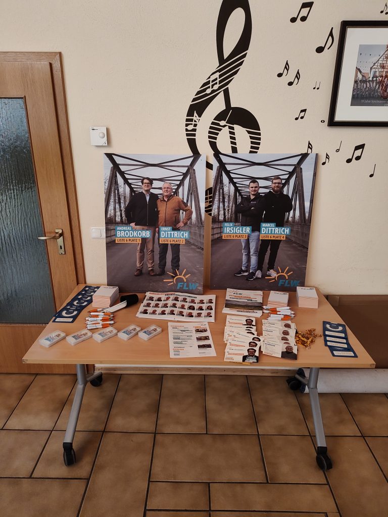 Obwohl der Abend ausdrücklich keine politische Veranstaltung war, nutzten wir die Gelegenheit, auf die in zwei Wochen anstehende Marktgemeinderatswahl in Meitingen hinzuweisen. Als kleines Dankeschön durften sich unsere Gäste zudem mit Werbematerialien wie Stiften und Blöcken eindecken.